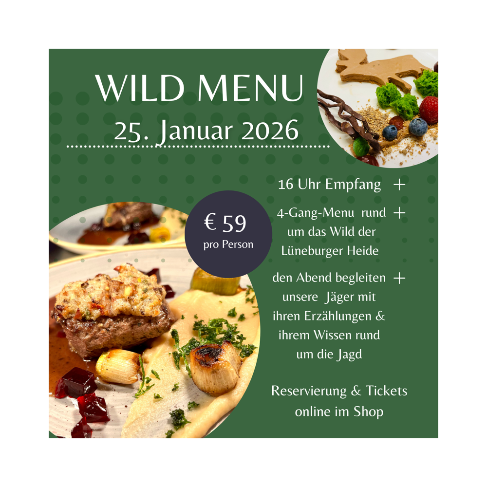 Starten Sie den Abend um 16 Uhr mit einem Empfang, bevor Sie ein exquisit zusammengestelltes 4-Gänge-Menü genießen – alles inspiriert vom besten Wild der Lüneburger Heide.